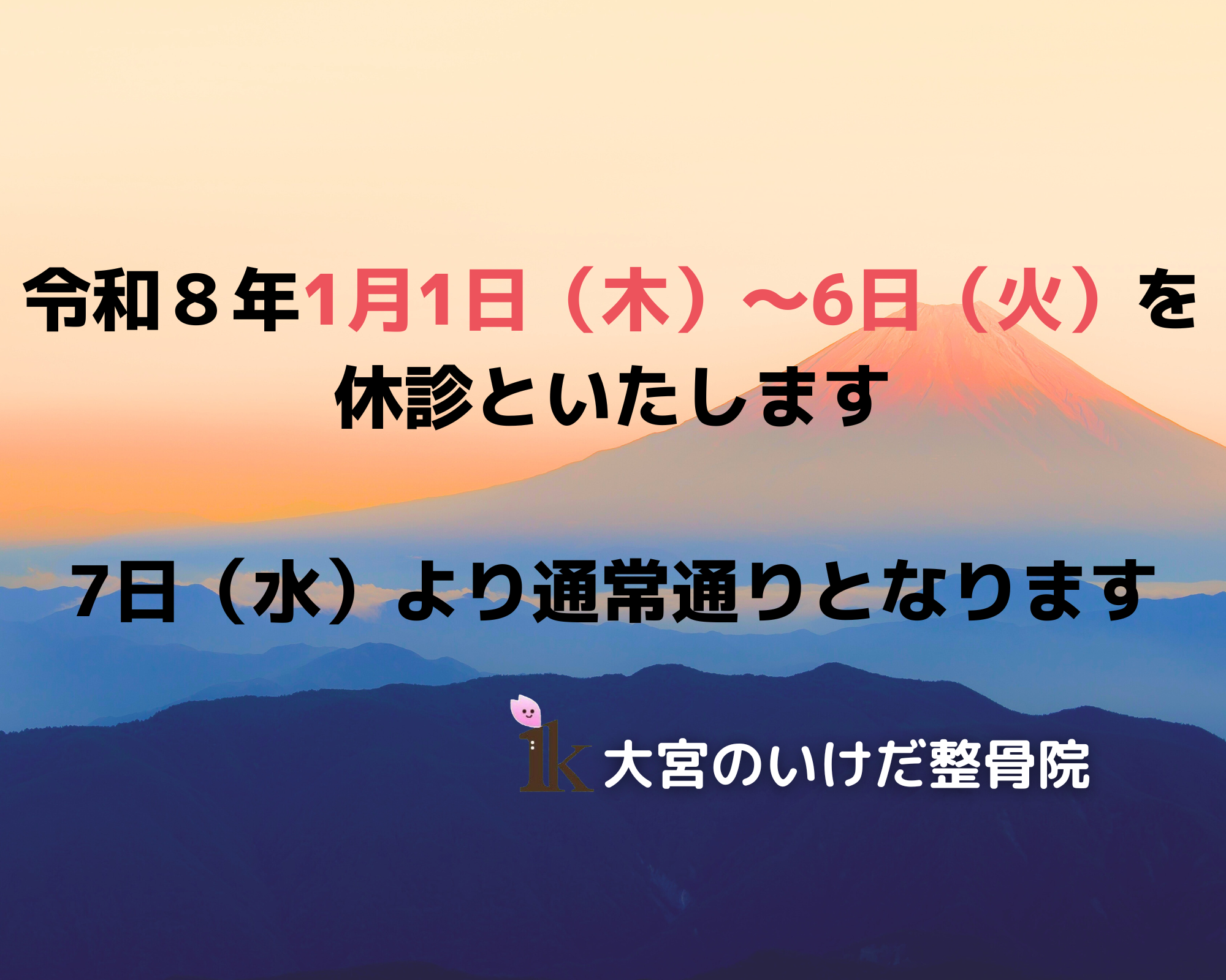 令和8年1月1日(木)~1月6日(火)まで休診といたします。