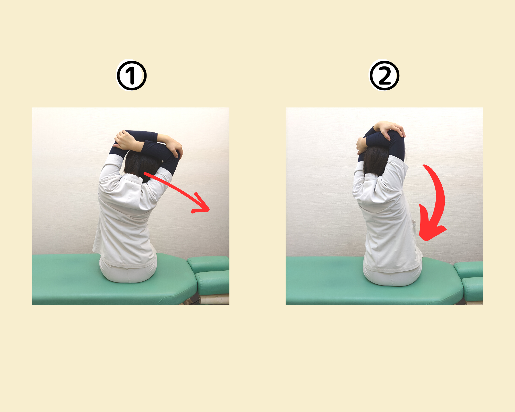 ① 椅子に座り、頭の上で腕を組んだ状態で体を左右に倒してみてください。